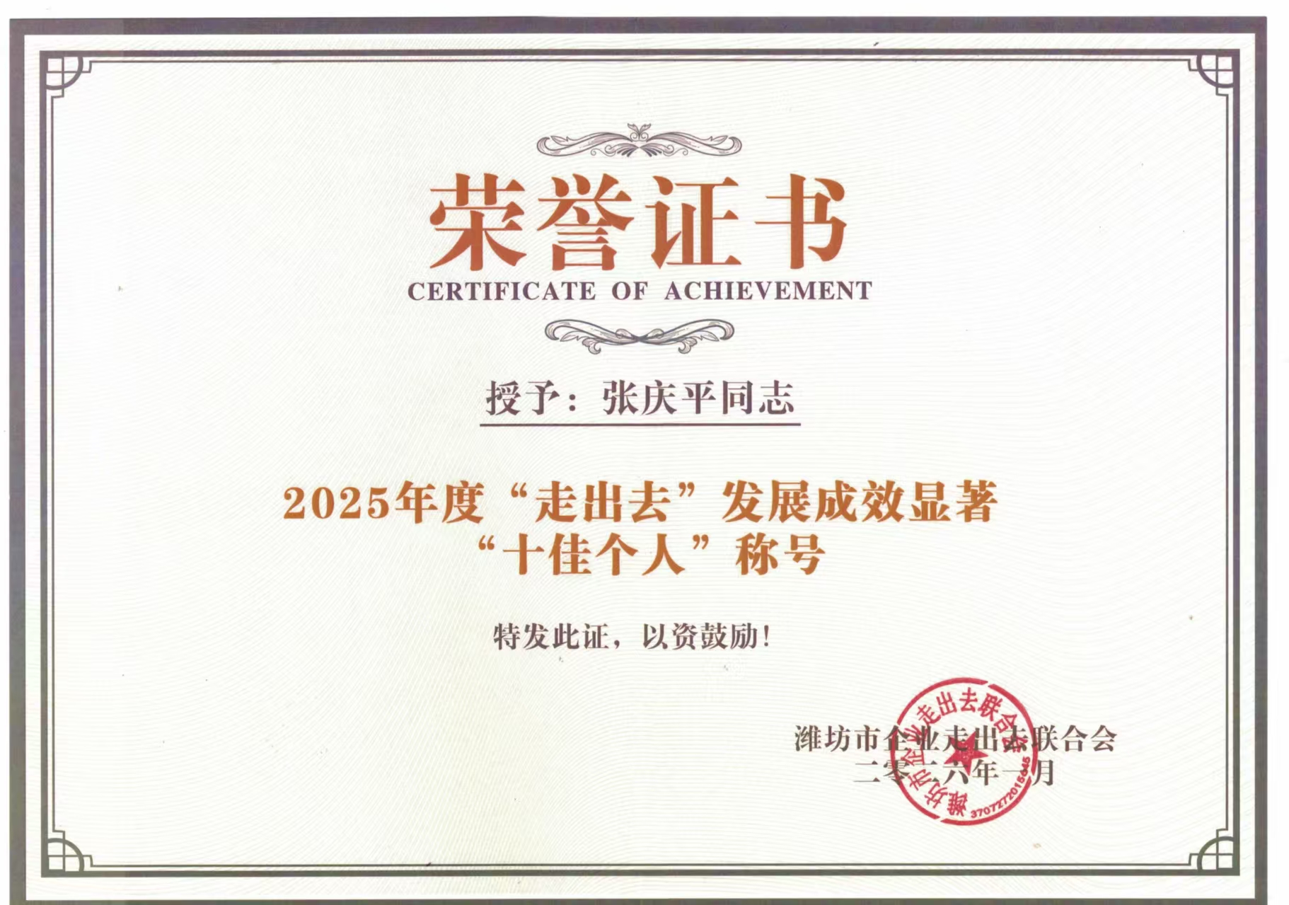 喜报 | 奥卓科技张庆平董事长获评潍坊市企业走出去联合会“十佳个人”