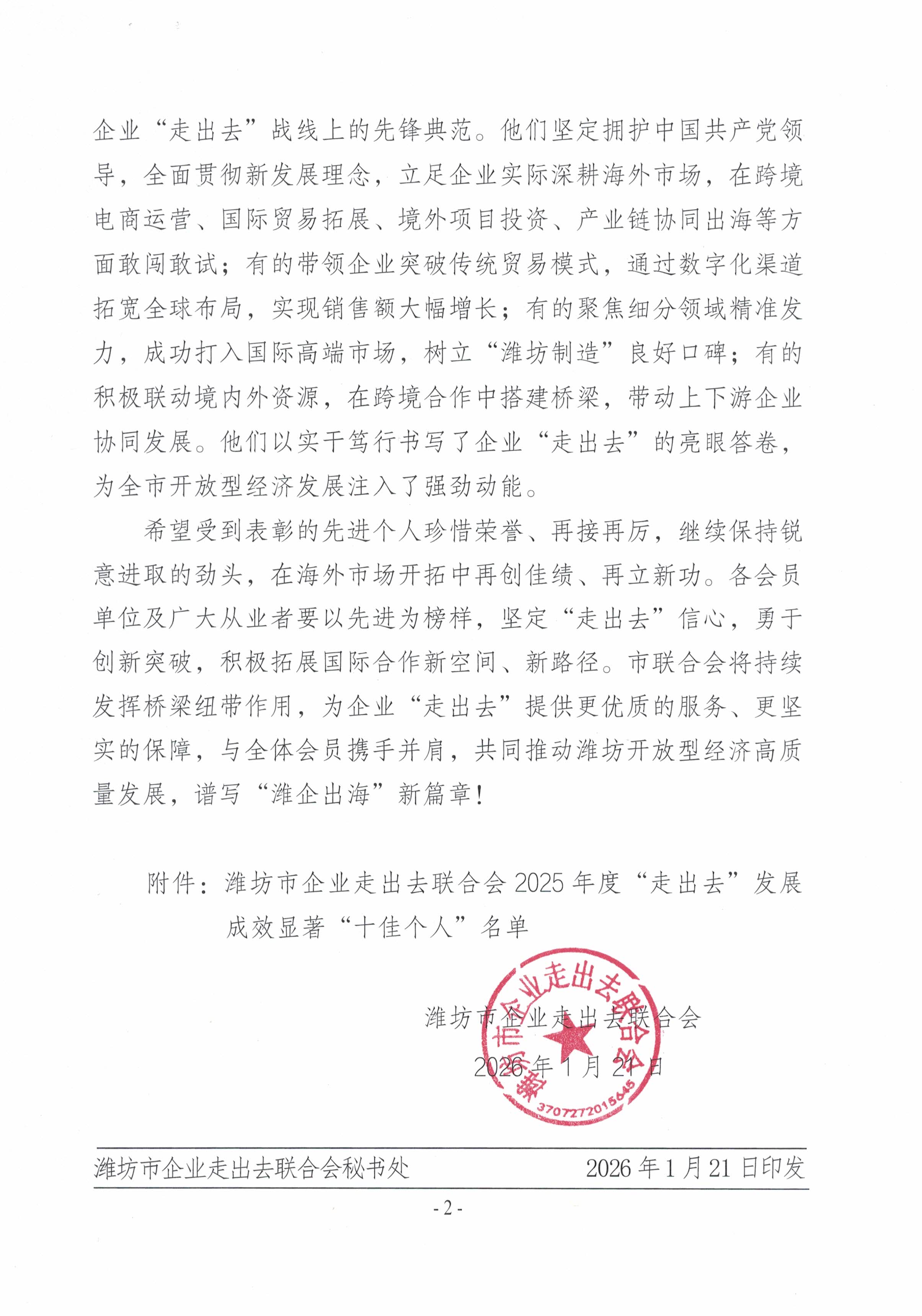 1月28日,为表彰先进,潍坊市企业走出去联合会召开突出贡献“十佳个人”表彰会议。潍坊市人大常委、市商务局一级调研员、潍坊市企业走出去联合会会长冯波出席会议,潍坊市企业走出去联合会秘书长王好田主持会议,受表彰的“十佳个人”、部分会员代表参加会议。会上王好田秘书长介绍 “十佳个人” 评选表彰情况,山东奥卓电气科技发展有限公司董事长张庆平凭借在企业国际化发展中的卓越引领与突出成效,成功获评2025年度“走出去”发展成效显著“十佳个人”称号。