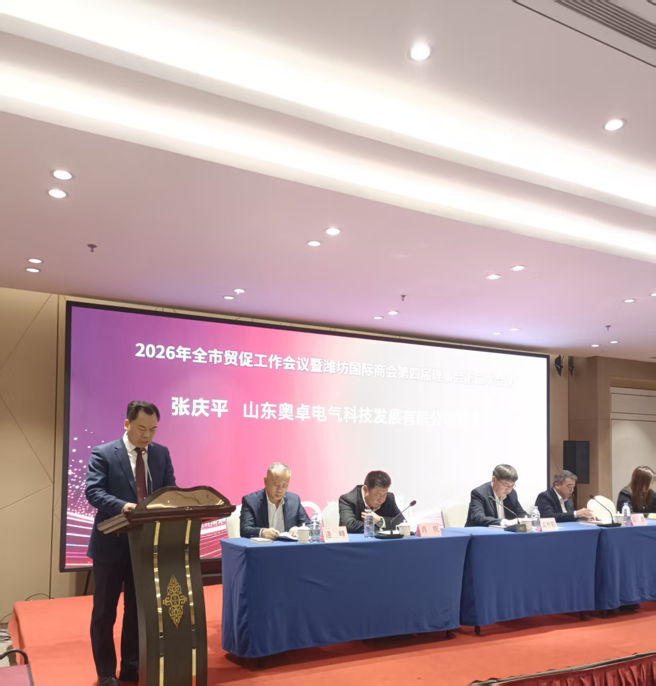 会上,传达了全国贸促工作会议、全省贸促工作会议、全市工作动员大会及市领导批示精神,通报了2025年度工作表现突出贸促机构、工作表现突出商会会员企业。山东奥卓电气科技发展有限公司作为中国国际商会潍坊商会副会长单位、中亚潍坊总商会会长单位凭借在国际经贸合作、商会共建、企业 “走出去” 等方面的突出成效,荣获中国国际商会潍坊商会 2025 年度工作表现突出会员企业,张庆平董事长作为会员企业代表在会上做交流发言,会后接受了媒体采访。